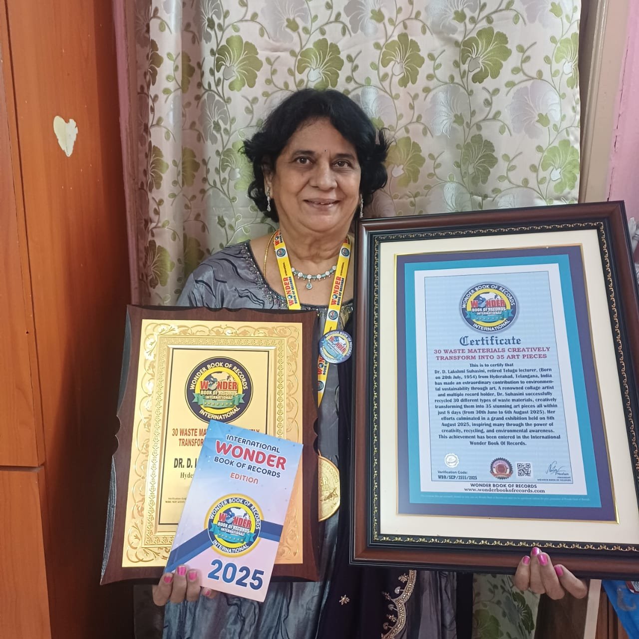Dr. D. Lakshmi Suhasini, retired Telugu lecturer, (Born on 20th July, 1954) from Hyderabad, Telangana, India has made an extraordinary contribution to environmental sustainability through art. A renowned collage artist and multiple record holder, Dr. Suhasini successfully recycled 30 different types of waste materials, creatively transforming them into 35 stunning art pieces — all within just 8 days (from 30th June to 6th August 2025). Her efforts culminated in a grand exhibition held on 8th August 2025, inspiring many through the power of creativity, recycling, and environmental awareness.